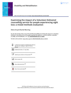 Gray, Debra and Manning, Rachel (2022) Examining the impact of a Volunteer-Delivered counselling service for people experiencing sight loss: a mixed methods evaluation. Disability and Rehabilitation. ISSN 0963-8288