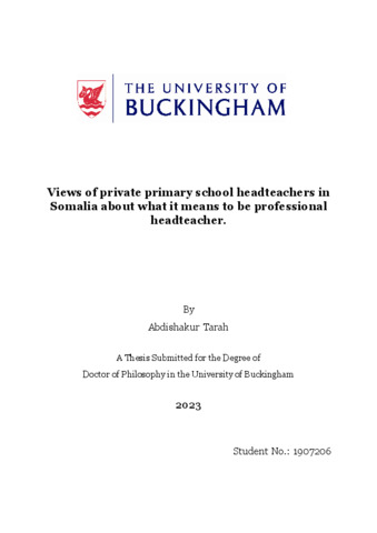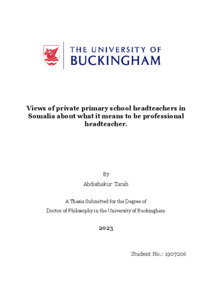 Tarah, Abdishakur (2023) Views of private primary school headteachers in Somalia about what it means to be professional headteacher. Doctoral thesis, The University Of Buckingham.