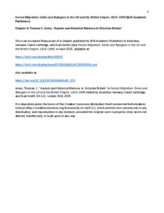 Jones, Thomas (2025) Asylum and Historical Memory in Victorian Britain. In: Forced Migration: Exiles and Refugees in the UK and the British Empire, 1815-1949. Studies in Global Migration History, 55/18 . Brill, Leiden and Boston, pp. 83-111. ISBN 9789004689138