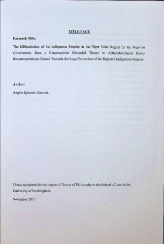 Bazunu, Angela Ighosotu (2017) The Militarisation of the Indigenous Peoples in the Niger Delta Region by the Nigerian Government; from a Constructivist Grounded Theory to Actionable-Based Policy Recommendations Geared Towards the Legal Protection of the Region's Indigenous Peoples. Doctoral thesis, The University of Buckingham.