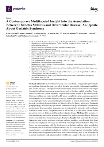 Hashi, Ridwan and Thamer, Rahma and Hassan, Ahmed and Canna, Khalid and Ahmed, Musaab and Hassan, Mohammed T and Badi, Safaa and Ahmed, Mohamed H (2025) A Contemporary Multifaceted Insight into the Association Between Diabetes Mellitus and Diverticular Disease: An Update About Geriatric Syndrome. Geriatrics, 10 (1). pp. 1-17. ISSN 2308-3417