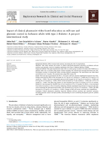 Badi, Safaa and Zainelabdien Suliman, Sara and Almahdi, Rayan and Aldomah, Mohammed A and Elkheir, Habab Khalid and Mohamed Izham, Mohamed Ibrahim and Ahmed, Mohamed H (2025) Impact of clinical pharmacist video-based education on self-care and glycemic control in Sudanese adults with type 2 diabetes: A pre-post interventional study. Exploratory Research in Clinical and Social Pharmacy, 19 (100617). pp. 1-10. ISSN 2667-2766