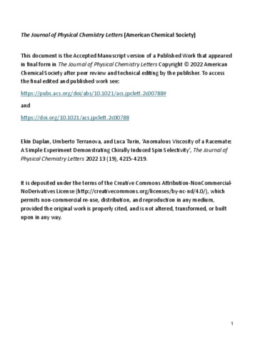 Daplan, Ekin and Terranova, Umberto and Turin, Luca (2022) Anomalous Viscosity of a Racemate: A Simple Experiment Demonstrating Chirally Induced Spin Selectivity. The Journal of Physical Chemistry Letters, 13 (19). pp. 4215-4219. ISSN eISSN: 1948-7185