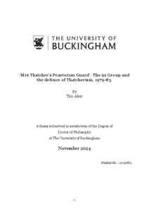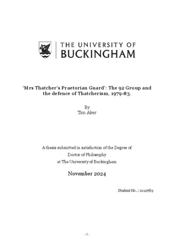 Aker, Tim (2024) ‘Mrs Thatcher’s Praetorian Guard’: The 92 Group and the defence of Thatcherism, 1979-83. Doctoral thesis, The University of Buckingham.